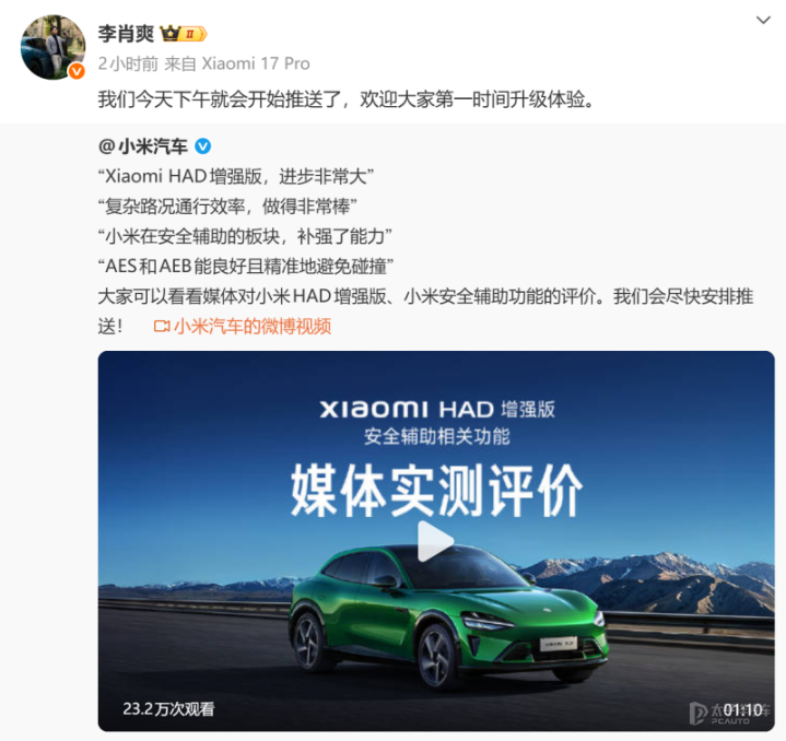 根据小米汽车官方表示,在经过强化学习+世界模型的持续训练,XiaomiHAD增强版在三大核心行车场景中实现了显著提升:纵向加减速更丝滑、横向变道更果断、路口选择更精准。